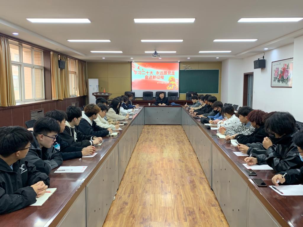 会上,王辉强首先带领师生共同学习了党的二十大报告和两会精神,结合报告中关于科技、教育、人才等方面的有关论述,给青年老员工讲解了,党和国家对教育、人才发展、就业等问题的关注,鼓励同学们抓住时代机遇,勇于承担时代重任,在新时代建功立业。他结合自己的经历对同学们提出三点建议:一是,树立远大理想,将个人价值的实现和建设社会主义现代化结合起来,树立正确是世界观、人生观、价值观;二是,做好人生规划,多读书、多实践,做有知识、有文化的新时代老员工。三是,要脚踏实地,正视人生遇到的挑战和挫折,勇于接受挑战,不负韶华,奋勇争先。随后,王辉强和同学们进行了亲切的座谈,了解他们的班级建设、思想状况、学习成绩等,对同学们提出的困难和疑惑进行了解答,帮助同学们正确认识知识和实践的辩证关系,指导同学们做好实践规划,度过精彩的大学时光。