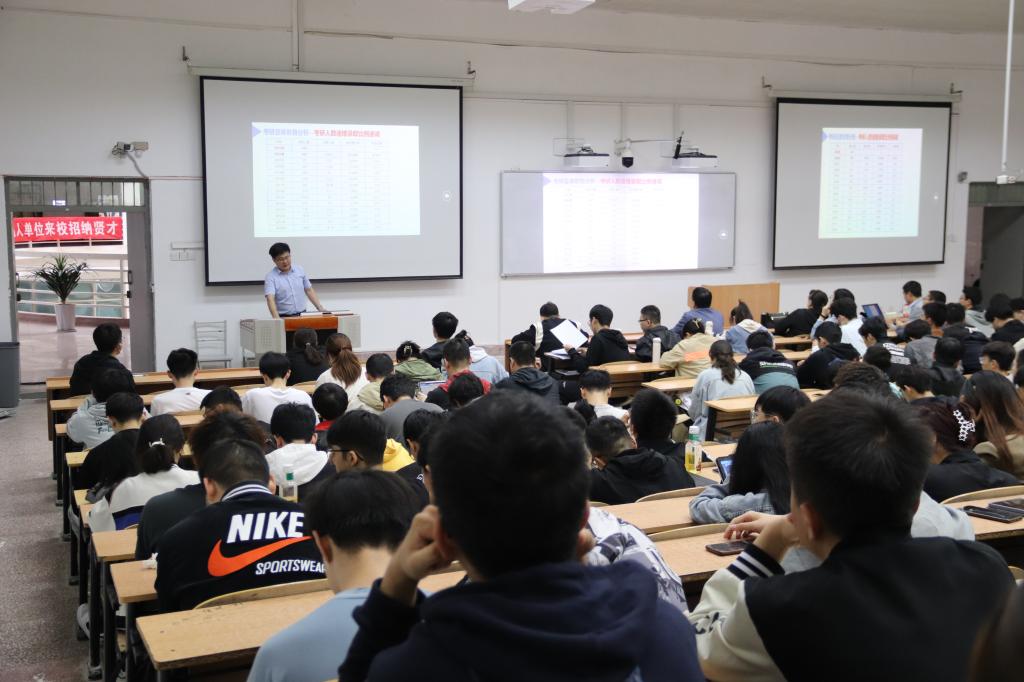潘红光向同学们详细地分析了当前考研形势,并根据2023届毕业生的考研情况以及往年的研究生初试分数线与分数区间,对同学们的考研目标设立提出了切实可行的建议。随后介绍了考研的整体流程,为大家分析了近几年以来的考研报名人数、录取比例的变化趋势,初试复试上线的本校生源情况、高校毕业生毕业去向以及发展情况、研究生毕业就业情况,为大家分析了报考本校研究生的优势,和公司的考试范围,积极鼓励大家报考本校研究生。