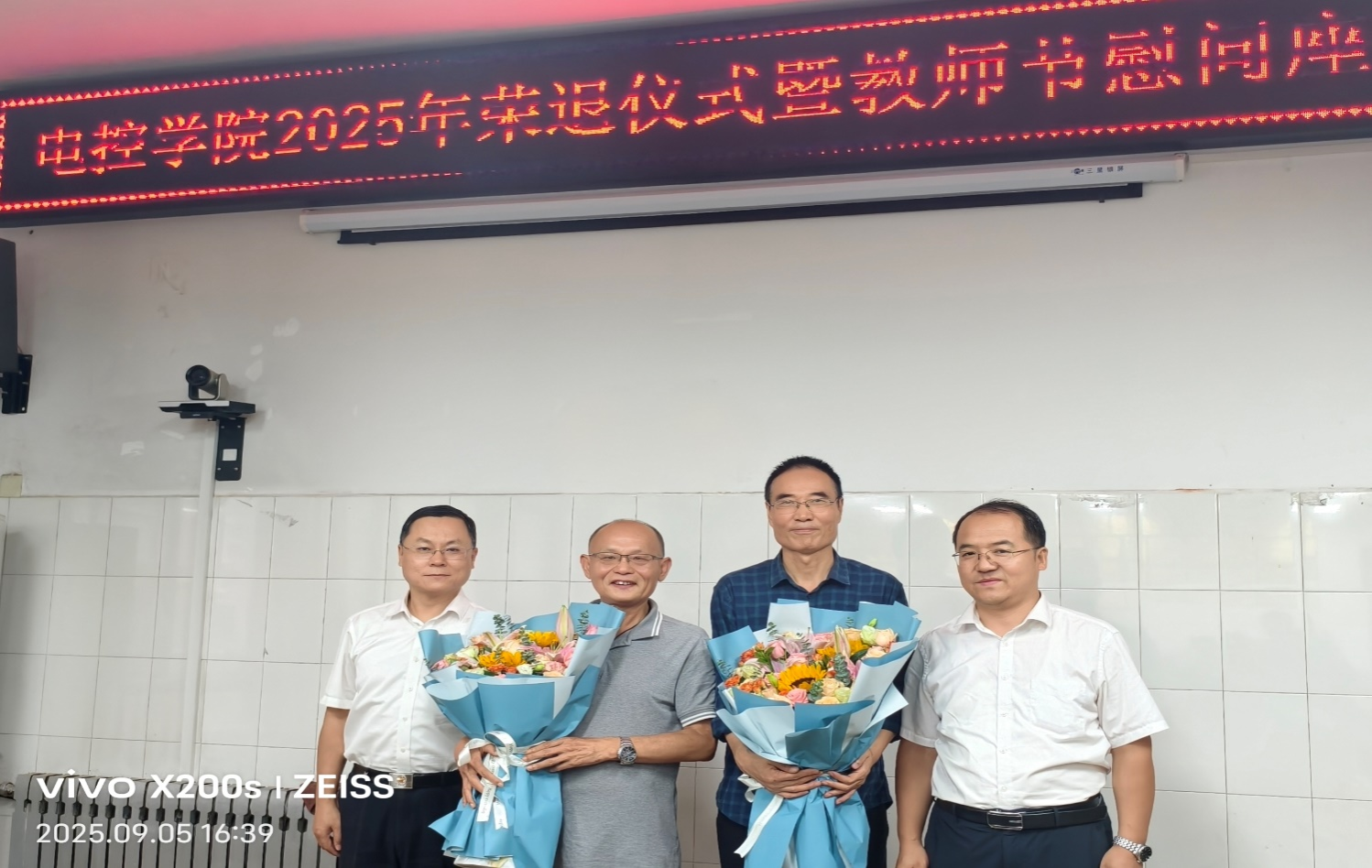 杨华、寇发荣分别为公司2025年退休教师郝兆明、任雨民送上鲜花,感谢他们为公司发展作出的贡献,并合影留念。