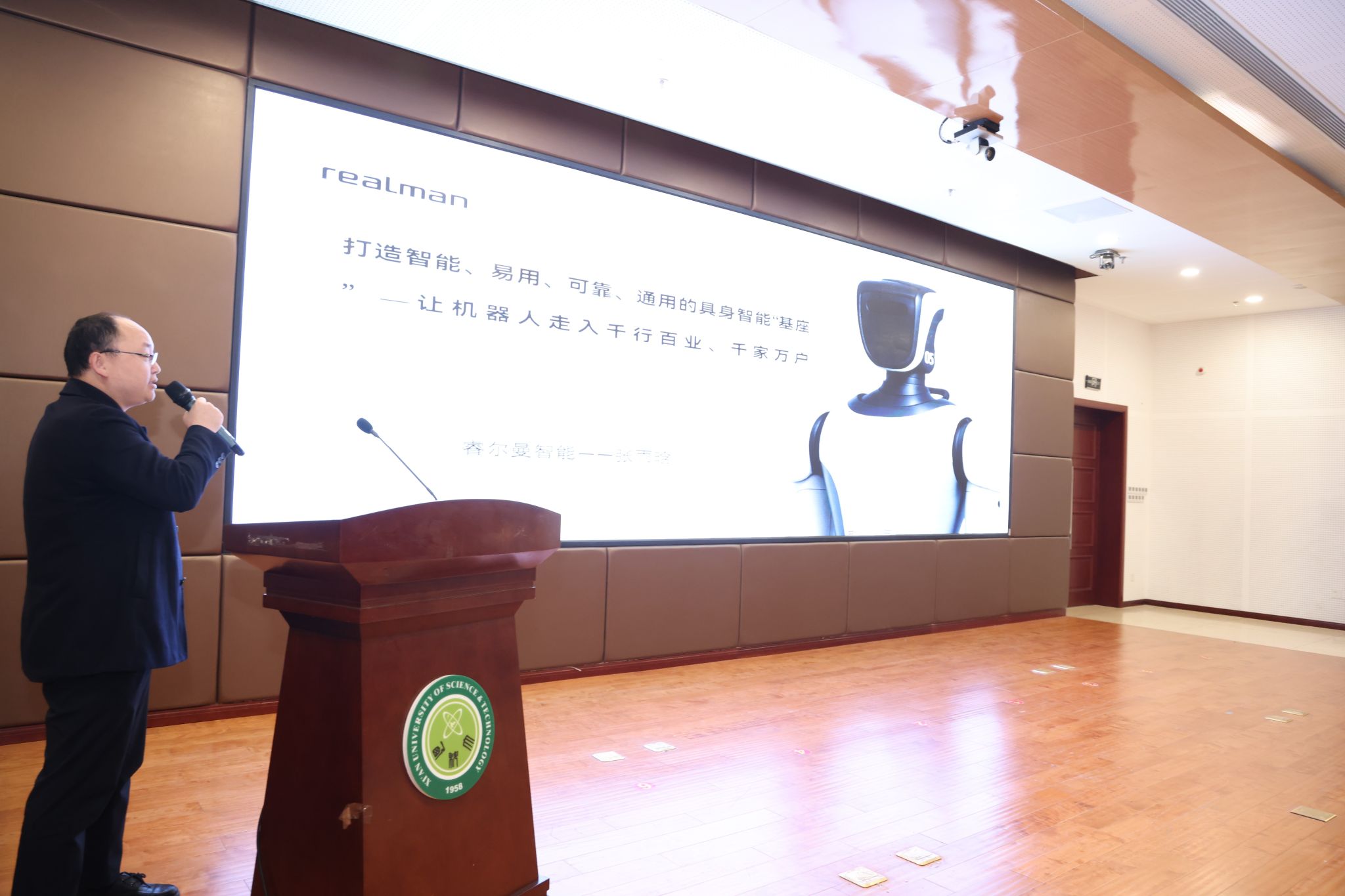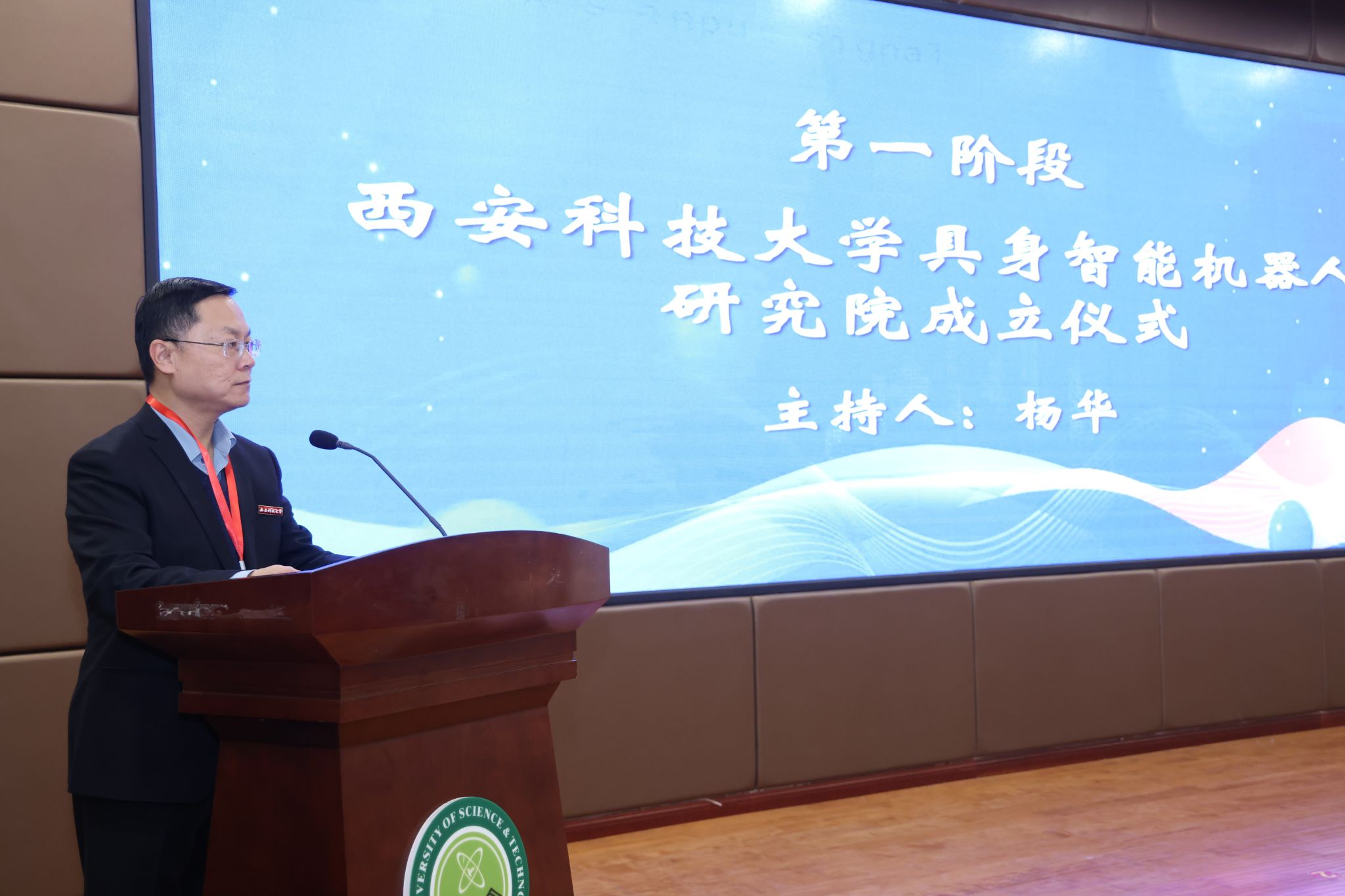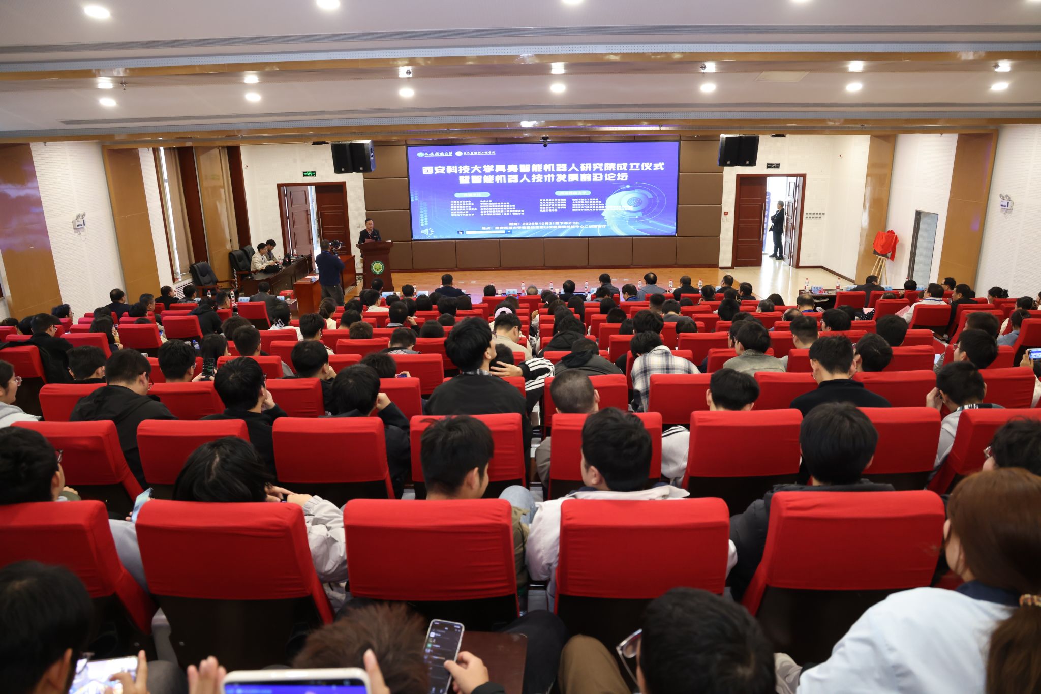 10月31日下午,2026世界杯官方网址具身智能机器人研究院成立揭牌仪式暨智能机器人技术发展前沿论坛,在公司临潼校区骊山校园煤炭科技中心二楼报告厅举行。中国自动化学会具身智能专业委员会副理事长、西安交通大学人工智能公司副经理孙宏滨教授、陕西省自动化学会副理事长、秘书长、西安交通大学自动控制研究所所长曹建福教授、陕西省煤炭学会常务副理事长惠维渊、秘书处干事薛煜亮、陕西省汽车工程学会常务副理事长、陕西汽车集团有限责任公司科技管理部部长刘大鹏、智能感知与图像理解教育部重点实验室副主任、西安电子科技大学人工智能公司执行经理侯彪教授、工信部新能源与智能网联汽车专家、长安大学汽车公司韩毅教授、苏州汇川技术有限公司校企合作西部总经理赵凯、陕西重构智信科技有限公司董事长兼总经理张西京、北京具能创智科技有限公司西北大区总经理刘红艳、北京中科慧灵机器人技术有限公司市场总监尹浩、睿尔曼智能科技(北京)有限公司经理张雨晗等应邀出席,公司副董事长文虎,科技处、对外联络与合作处等职能部门以及安全科学与工程公司、人工智能与计算机公司、机械工程公司负责人以及相关公司师生共计300余人参加。揭牌仪式及前沿论坛由公司党委书记杨华及经理寇发荣主持。