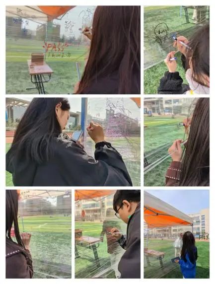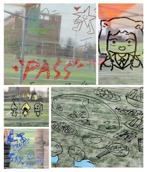 活动以“非语言表达+群体疗愈”为核心设计理念,创新性地采用保鲜膜作为创作载体,为员工提供了一个开放、自由的情绪表达空间。活动现场,工作人员提前铺设宽60厘米的保鲜膜,并配备了12色涂鸦笔,供参与者自由使用。同学们通过书写文字、绘制图案、涂抹色彩等方式,将内心的情绪、困惑与期望直观地呈现出来,形成了一幅充满创意与情感的“心理画卷”。在活动过程中,参与者不仅可以自由创作,还可以浏览他人作品,通过这种跨群体的互动形式,促进心灵共鸣与情感交流。许多同学表示,这种形式让他们能够暂时放下学业压力,以一种轻松的方式表达内心的真实感受,同时也能从他人的创作中获得启发与支持。活动期间,现场气氛活跃,欢声笑语不断。于飞老师在活动现场与同学们进行了深入交流,鼓励大家通过艺术表达释放情绪,并分享了一些心理健康的小技巧。心理部成员则全程协助,确保活动顺利进行,并为有需要的同学提供心理支持